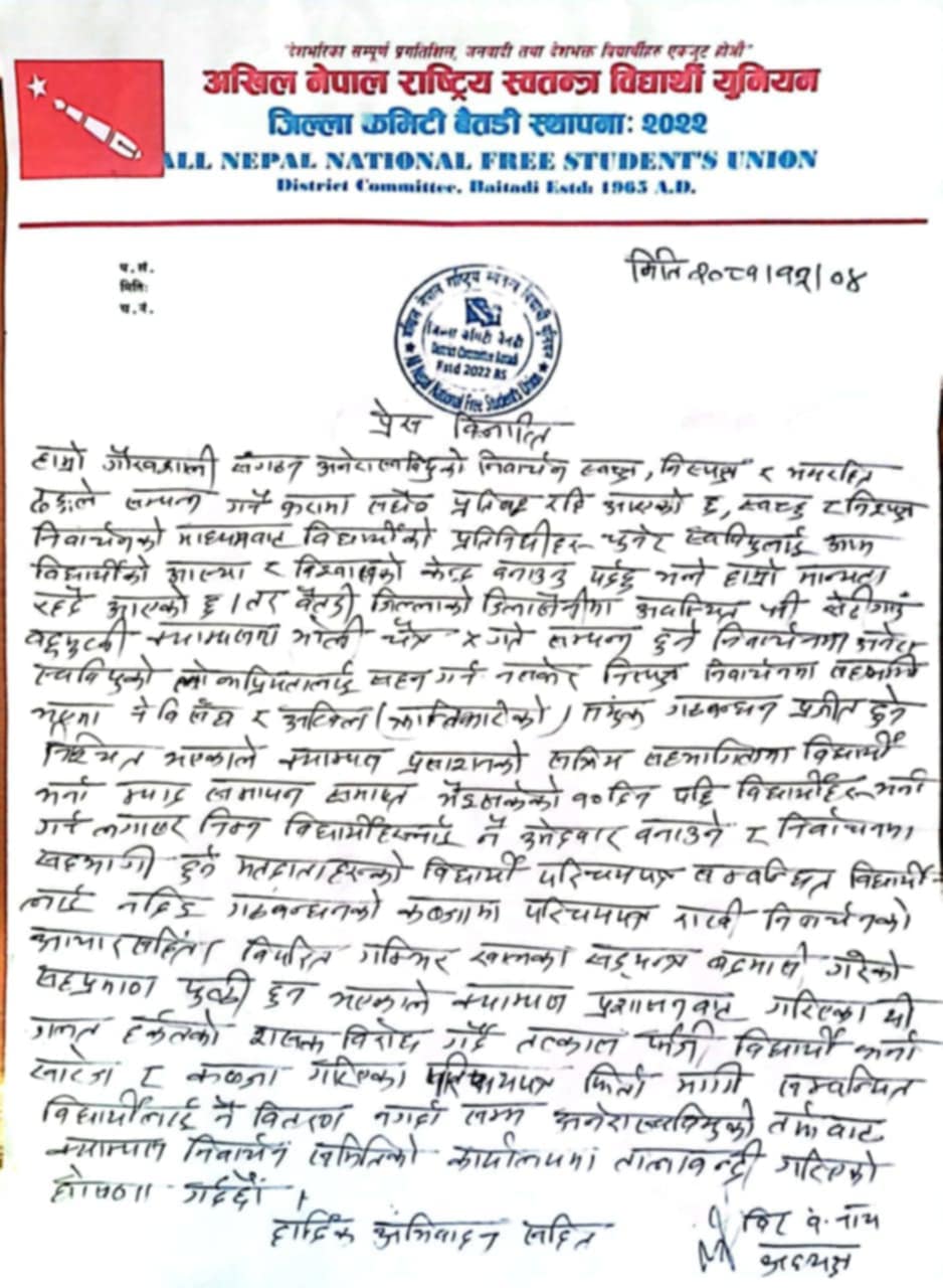 बैतडी: स्ववियु निर्वाचनको मुखैमा बैतडीको एक क्याम्पसमा तालाबन्दी गरिएको छ । जिल्लाको गोकुलेश्वरमा रहेको सेटीगांउ बहुमुखी क्याम्पसमा तालाबन्दी गरिएको हो ।