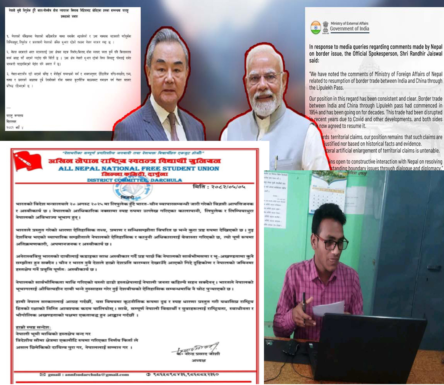 दार्चुला : अखिल नेपाल राष्ट्रिय स्वतन्त्र विद्यार्थी युनियन (अनेरास्ववियु) जिल्ला समिति दार्चुलाले हालै भारत–चीनबीच भएको व्यापारिक सहमति तथा सम्झौतामा नेपालको भूभाग लिम्पियाधुरा, लिपुलेक र कालापानीलाई समेटिएको भन्दै तीव्र विरोध जनाएको छ।