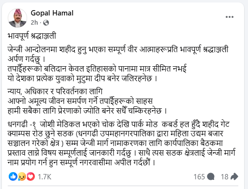 मेयर हमालले आफ्नो सामाजिक सञ्जालमार्फत सार्वजनिक रूपमा घोषणा गर्दै भनेका छन्-जेन्जी आन्दोलनमा शहीद भएका वीर आत्माहरूको सम्मानमा यो महत्वपूर्ण कदम चालिएको हो ।