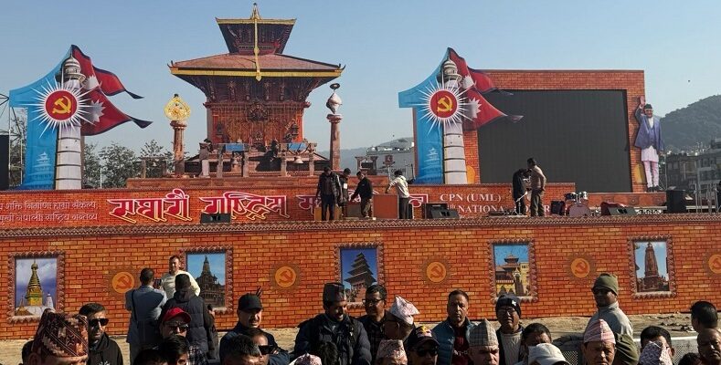 लिच्छविकालमा राजा हरिदत्तले स्थापना गरेको चाँगुनारायणको ऐतिहासिक मन्दिरलाई एमालेले मुख्य स्वरुपमा राखेर उपत्यकाका महत्त्वपूर्ण विभिन्न मन्दिर एकै ठाउँ देखाउने गरी ठूलो र कलात्मक मञ्च निर्माण गरेको जनाएको छ । टाढासम्म रहेका सहभागीले वक्ताले बोलेको प्रस्ट देखिने गरी मञ्चको दायाँबायाँ ३० फिट अग्ला दुईवटा ‘एलइडी स्क्रिन’ राखिएका छन् । तीन किलोमिटर परसम्म सुन्न सकिने एक सय १५ वटा उच्च गुणस्तरका ‘साउन्ड सिस्टम’ जडान गरिएको र मञ्च अगाडि देशभरबाट आएका नेता, मन्त्री, सांसद एवम् विभिन्न कुटनीतिक नियोगका प्रतिनिधिका लागि २५ हजार कुर्सी राखिएको एमालेले जनाएको छ ।