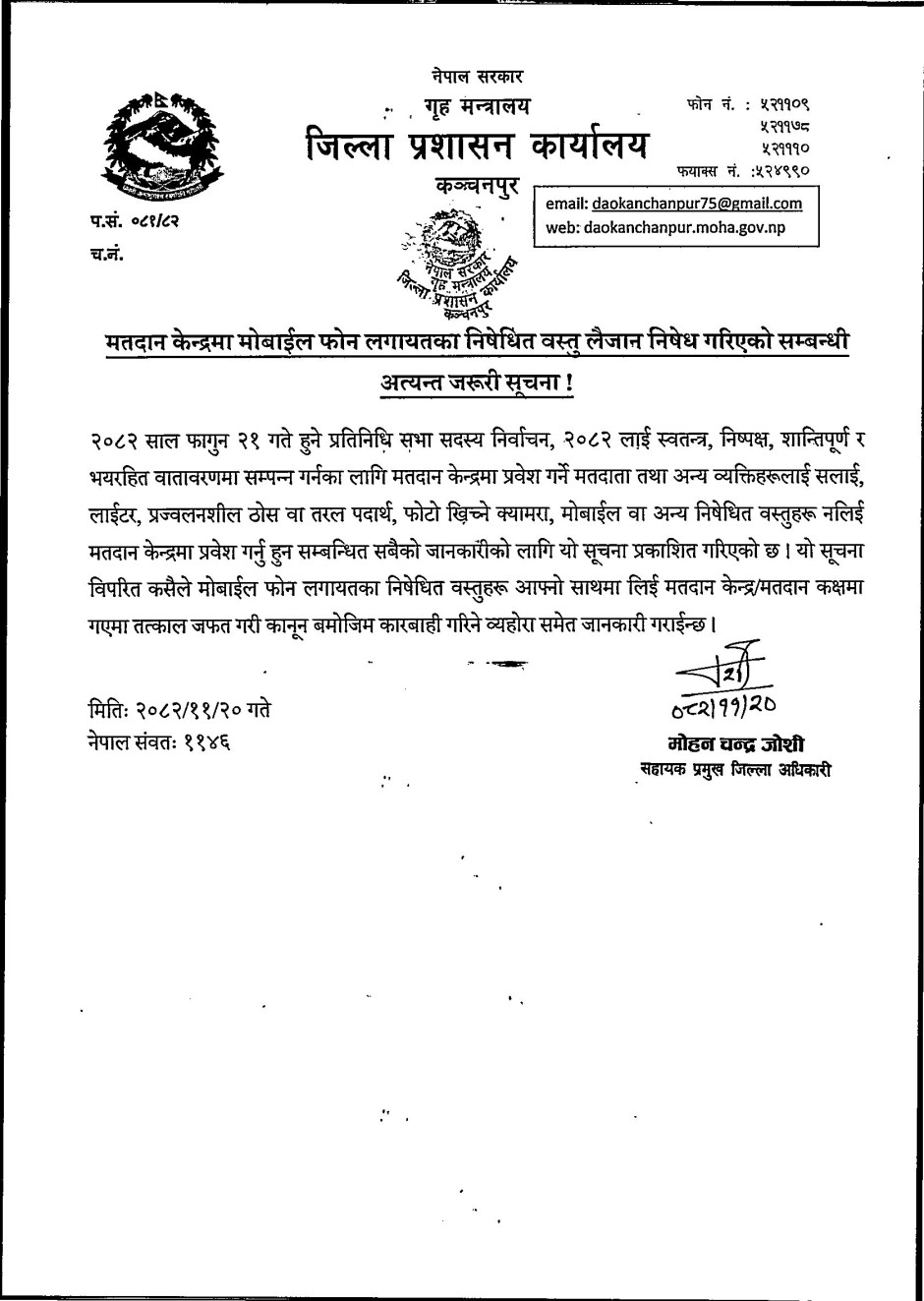सहायक प्रमुख जिल्ला अधिकारी मोहनचन्द्र जोशीका अनुसार मतदान केन्द्रमा प्रवेश गर्ने मतदाता तथा अन्य व्यक्तिले सलाई, लाइटर, प्रज्वलनशील ठोस वा तरल पदार्थ, फोटो खिच्ने क्यामेरा, मोबाइल फोन वा अन्य निषेधित वस्तु साथमा ल्याउन पाउने छैनन्। सूचनाविपरीत कसैले मोबाइल लगायतका निषेधित सामग्री साथमा लिएर मतदान कक्षमा प्रवेश गरेमा ती वस्तु तत्काल जफत गरी कानुनअनुसार कारबाही गरिने प्रशासनले चेतावनी दिएको छ।