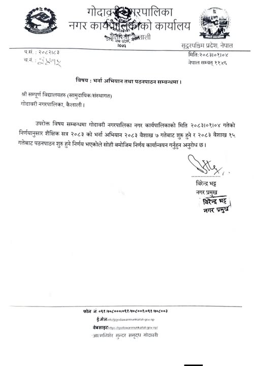 अत्तरिया : कैलालीको गोदावरी नगरपालिकाका सामुदायिक तथा संस्थागत विद्यालयहरूमा २०८३ सालको भर्ना अभियान वैशाख ७ गतेदेखि सुरु हुने भएको छ । वैशाख १५ गतेदेखि पठनपाठन सुरु गर्न नगरपालिकाले अनुरोध गरेको छ । नगरपालिकाको आज बसेको कार्यपालिकाको वैठकले उक्त निर्णय गरेको हो ।
