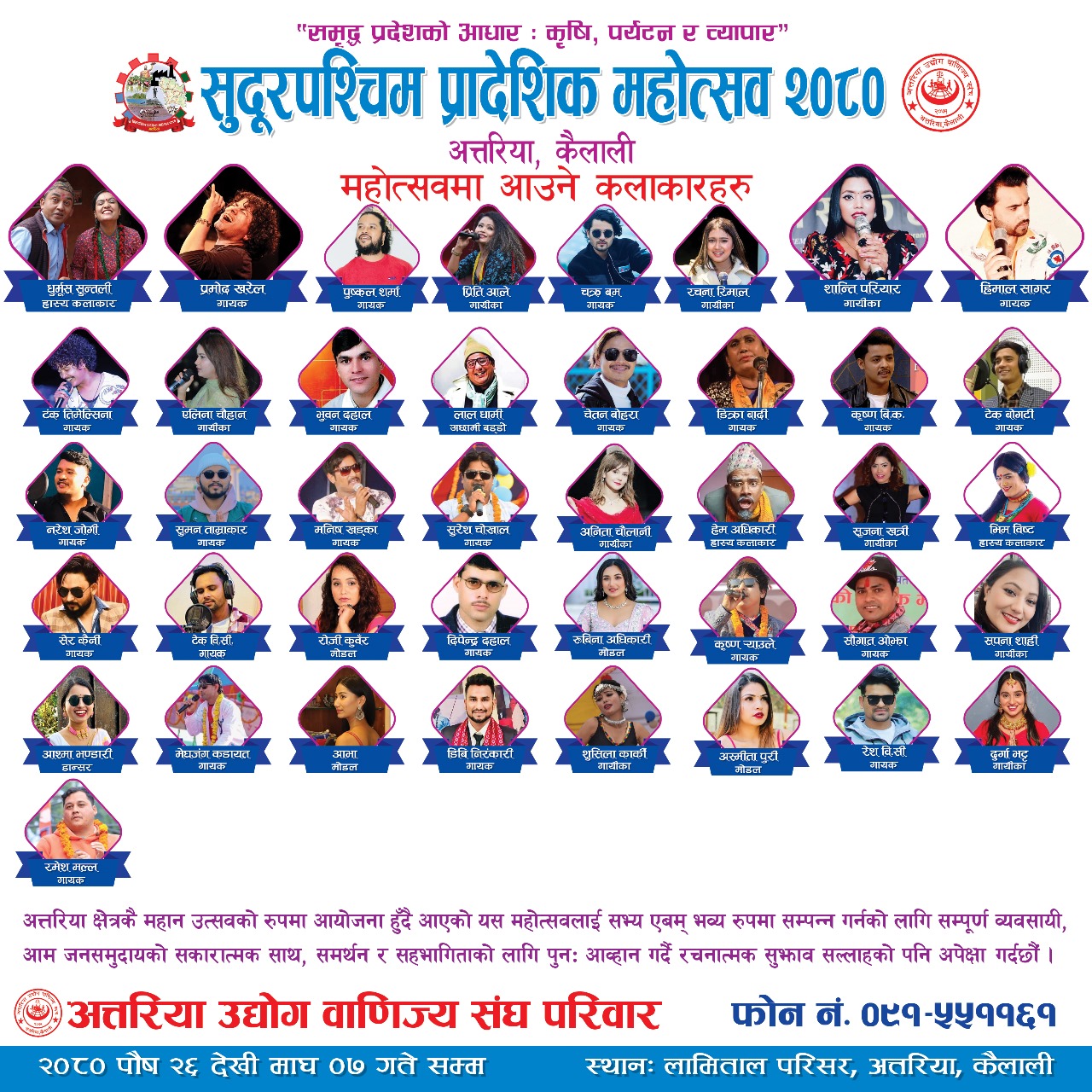 अत्तरिया : कैलालीको अत्तरियामा हुने सुदुरपश्चिम प्रादेशिक महोत्सवमा आउने राष्ट्रिय तथा स्थानिय कलाकारहरुको टुंगो लागेको छ । अत्तरिया उद्योग बाणिज्य संघको आयोजनामा यहि पौष २६ गतेदेखी माघ ७ गतेसम्म सञ्चालन हुने महोत्सवमा आउने कलाकारहरुको नाम सार्वजनिक गरिएको हो ।