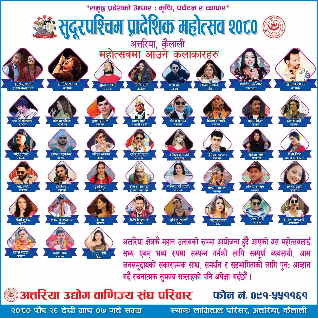 अत्तरिया : अगामी २६ पुसदेखि अत्तरियामा आयोजना हुने सुदूरपश्चिम प्रादेशिक महोत्सवमा स्थानीय कलाकारको वर्चश्व रहने भएको छ ।सुदूरपश्चिम प्रदेशमा सञ्चालन गरिने मेला महोत्सवमा स्थानीय कलाकारलाई बेवास्ता गरेको गुनासो बढेका बेला अत्तरियामा भने आयोजकले स्थानीय कलाकारलाई प्राथमिकता दिएको पाइएको छ ।