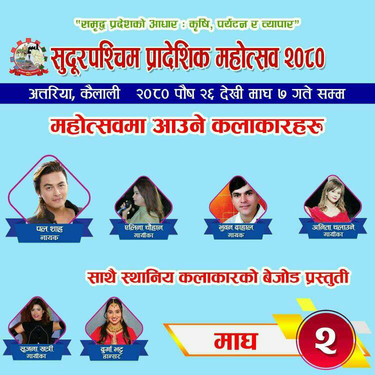आज महोत्सवमा गायिका एलिना चौहान, अनिता चलाउने, सृजना खत्री, लोकदेउडा गायक भुवन दाहाल, डान्सर दुर्गा भट्टको प्रस्तुती रहने आयोजक अत्तरिया उद्योग वाणिज्य संघका सांस्कृतिक संयोजक रमेश भट्टराईले जानकारी दिए ।