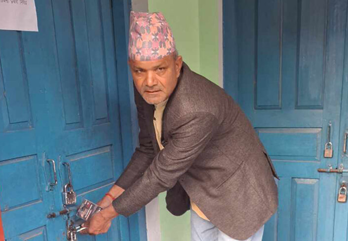अध्यक्ष मण्डलले सोमबार पदाधिकारीमा सर्वसम्मत घोषणा गर्ने तयारी गरेपछि सचिवमा उम्मेदवारी दिएका कर्णबहादुर चन्दले जिल्ला पार्टी कार्यालयमा तालाबन्दी गरेका छन् ।